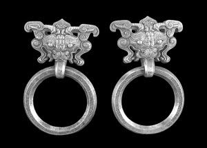 這對門環(huán)為純銀澆鑄,是清朝乾隆時期皇家造辦處專為圓明園中的建筑特制的門環(huán),樣子仿西周的饕餮銅環(huán),不同于當(dāng)時常見的獅首或古釘狀式樣,十分罕見。