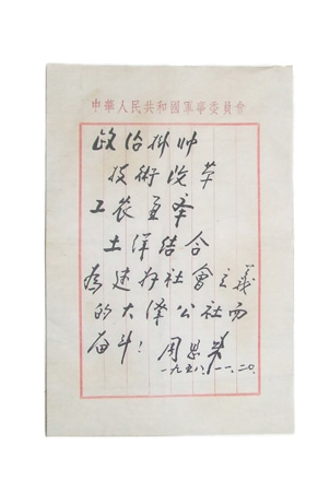 記者從辛先生提供的照片上看到,手跡為9橫行題詞,用毛筆寫在中華人民共和國軍事委員會16開信箋上,信箋為宣紙。內(nèi)容為:政治掛帥、技術(shù)改革、工農(nóng)并舉、土洋結(jié)合,為建好社會主義的大澤公社而奮斗!(記者 胡紅波)