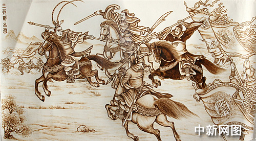 為避免干擾,王國棟把工作室設在女兒家樓房的地下室里。一塊案板,一盞臺燈,一把電烙鐵,一副老花鏡,幾本參考書,就是他創(chuàng)作的全部家當。每天早5點起床,晚11點休息,他把全部心思都花在了烙畫上。熟讀原著,找懂三國的朋友切磋,確定故事題目,反復修改,定稿,烙繪,又是一年輪回,老王的100米長卷81個故事圖譜也出來了。為了使畫面線條更加流暢,他苦心鉆研,改革了烙鐵的銅筆頭。為了增強表現(xiàn)力,他嘗試著在烙畫中添加輔料來增強表現(xiàn)力。這些,都使《三國演義》的繪制技巧和藝術(shù)創(chuàng)作又達到了一個嶄新的高度。