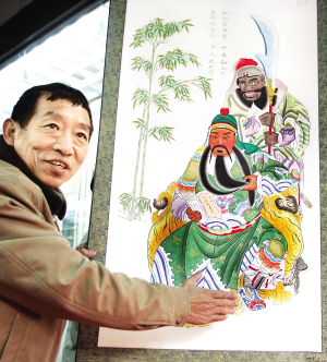 年畫這門原先日漸凋零的傳統(tǒng)藝術(shù),正隨著國家對民族文化的振興而復(fù)興。不過,剛呈現(xiàn)出興旺的勢頭,就有一批假貨跟進,在今天于三山會館開幕的“花樣年畫——海上年俗系列展之二”上,來自天津楊柳青、山東濰坊和河北武強的三位具有代表性的年畫藝術(shù)家,對此不約而同地嘆起了苦經(jīng)。