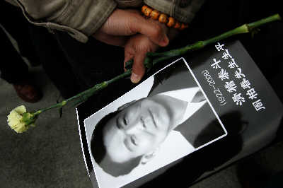 “高山仰止有底蘊(yùn)幽默,松柏延綿無窮盡春色”,在潔白的百合叢中,一代滑稽戲大師周柏春安詳?shù)厮,他帶走了他那?jīng)典的“冷面”,但留下的卻是永遠(yuǎn)的笑聲。昨天,滑稽戲泰斗周柏春的追悼會在龍華殯儀館舉行,數(shù)千名群眾自發(fā)趕到現(xiàn)場,手持黃色康乃馨為周老送上最后一程。