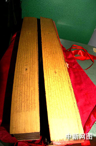 記者在贈(zèng)送儀式上看到,《貝葉經(jīng)》用紅綢布包得嚴(yán)嚴(yán)實(shí)實(shí)放在一個(gè)托盤上。儀式結(jié)束后,寶峰寺中主持輕輕打開了紅綢布,經(jīng)書漸漸露了出來。經(jīng)書長約四十厘米,寬、厚均有十多厘米。