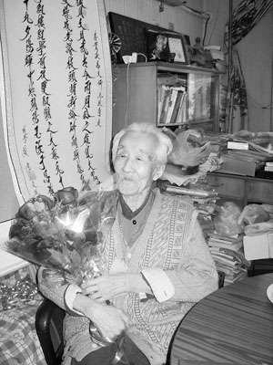 周汝昌手捧鮮花,滿面笑容。接過劉文莉送來的一對紫檀木鎮(zhèn)紙時,周老笑著說:“謝謝,謝謝!”