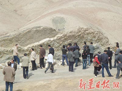 2008年4月10日,記者隨中德新疆野外科考隊(duì)專家,前往恐龍足跡化石現(xiàn)場(chǎng)。