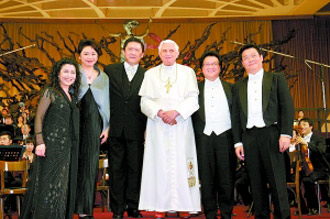 隨后,教皇走上舞臺(tái)與余隆和幾位歌唱家握手,并發(fā)表了5分鐘的演講,教皇表示昨晚的演出是一份稱心如意的禮物,“事實(shí)上這個(gè)音樂會(huì)在某種程度上讓我們接觸到中國社會(huì)活潑輕快的現(xiàn)實(shí),在這群出色的藝術(shù)家身上,我們可以看到他們所代表的偉大中國文化和音樂傳統(tǒng),他們的演繹也幫助我們更了解一個(gè)民族的歷史”。在講話最后,教皇竟然出人意料的用中文說出“感謝大家并祝愿大家一切順利”,并主動(dòng)邀請(qǐng)幾位藝術(shù)家一起合影,這也是教皇回贈(zèng)給中國藝術(shù)家的禮物。