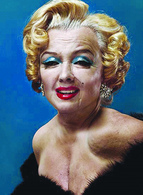 上世紀(jì)50年代的性感女神瑪麗蓮·夢露1962年去世時(shí)年僅36歲,如果她活到現(xiàn)在,將有82歲。她同樣也難逃“時(shí)間之斧”的摧殘。照片中的她皮膚松弛,滿臉皺紋。不過,或許由于曾施行了整容手術(shù),在涂抹了濃厚的唇膏和藍(lán)色眼影之后,夢露的微笑依然能找到當(dāng)年性感痕跡。然而,由于老年夢露身體已經(jīng)明顯皺縮,她身上那件時(shí)髦的緊身低胸禮服顯然已不合尺寸,仿佛隨時(shí)都有掉下來的可能。