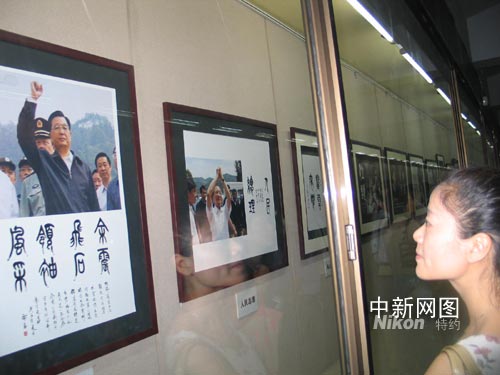 記者今天在開幕式現(xiàn)場看到,作品主要為篆書,每幅配以背景圖片,災區(qū)人民的苦難、人民總理奔走廢墟之中的身影、殘垣斷壁間不懈抗爭的生命、救援官兵不拋棄不放棄的努力……一個個場景、一個個片段、一個個故事,充滿了震撼人心的力量。