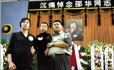 毛澤東的孫子毛新宇帶著妻子和兒子一直守在親手布置的靈堂內(nèi)。大廳中央,掛著黑色的條幅“沉痛悼念邵華同志”,條幅下方則是邵華穿著新軍裝微笑的黑白照片,黨和國(guó)家領(lǐng)導(dǎo)人送的花圈被一字排開(kāi)。