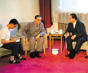 記得周總理自從病重以后,會見外賓時總是讓客人坐松軟的沙發(fā),自己坐高沙發(fā)椅子?墒沁@次,周總理坐的是和外賓一樣的單人沙發(fā)。當(dāng)周總理走到沙發(fā)邊時,首先舉手請維爾德茨落座,然后自己緩慢地坐了下來。坐時把右手拳指頂在沙發(fā)座上,左胳膊肘撐在沙發(fā)扶手上,好像在支撐和減輕著微微前傾的身體重量。雖然身體已很衰弱,但周總理面容慈祥和藹,聲音還是那樣剛勁有力,目