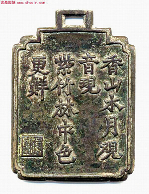 “香山水月觀音現(xiàn),紫竹林中色更鮮!弊蛉,一塊刻有無名詩句的清代古銅牌現(xiàn)身渝北區(qū)。對此牌,收藏界有兩種說法。一說,此牌是“名妓號牌”;二說,是當(dāng)時某地下組織的“會員證”。