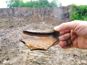 聞?dòng)嵹s來(lái)的南京市博物館考古隊(duì)員在挖塌的斷壁泥土中隨便撥弄,就找到幾塊碎陶片!澳憧矗@塊是黑陶、這塊是夾砂紅陶,從陶片看,這個(gè)器皿不小,上面還有不是很規(guī)則的戳印紋。”記者仔細(xì)一看,上面刻的紋飾非常精美。一位考古專家說(shuō),此次經(jīng)過(guò)考古勘探,郭家山坑商周時(shí)期古文化遺址長(zhǎng)220米,寬120米左右,面積達(dá)到2.3萬(wàn)平方米。從斷面上可見(jiàn)大量紅燒土層及紅陶、灰陶片,其中可辨器有罐、鬲、鼎等。據(jù)悉,考古人員在這個(gè)文化遺址上一共探測(cè)到了8個(gè)文化層,最底層則是3000多年前的商周文化層。