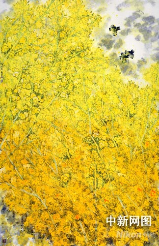 龐舜堯在油菜花系列組畫的創(chuàng)作上,與傳統(tǒng)意義上的寫意花鳥畫有著明顯不同。組畫以潑彩為主,富于抽象意味,作品以耀眼奪目的黃色寓意3月的萬(wàn)物復(fù)蘇與生命活力的四溢,大面積的黃色,以深淺不同、明暗差別體現(xiàn)3月菜花遍地黃的詩(shī)意景象。在該套作品里,油菜花的具體性已經(jīng)被剝離剩下的近乎成為抽象的意向感覺(jué),明麗的黃色刺激著視覺(jué),讓人興奮。