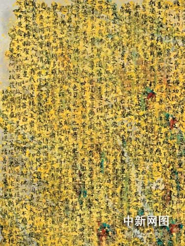 這種表現(xiàn)手法,還體現(xiàn)在文字系列的組畫上。龐舜堯是中國(guó)書法家協(xié)會(huì)會(huì)員,長(zhǎng)年抄寫佛經(jīng),書法舒朗雋秀,富有禪意。該組繪畫由細(xì)小的《金剛經(jīng)》文字組成,將文字作為畫面的肌理,遠(yuǎn)觀是現(xiàn)代風(fēng)格的抽象畫,近看則是由細(xì)小的佛經(jīng)文字組成。據(jù)龐舜堯介紹,最大的一副作品,由3萬(wàn)個(gè)工楷寫滿,整個(gè)創(chuàng)作持續(xù)了將近一年多的時(shí)間。