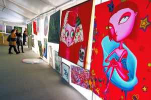 4000平方米的臨建大棚里,1700多幅當(dāng)代藝術(shù)品一個挨一個掛著。門口,一塊從字體到用色都不那么陽春白雪的牌子上寫著“宋莊藝術(shù)集市”!敖衲90%作品的標(biāo)價只相當(dāng)于去年的一半!奔胸(fù)責(zé)人王經(jīng)理說。