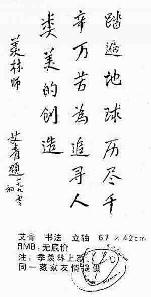 艾青妻子在看到復(fù)印件中艾青的書法作品后對(duì)北京媒體表示,這幅作品可100%肯定為假的:“從哪方面來說都是假的,艾青和季羨林沒什么交往,從字跡來說是假的,從年代上來說也不可能。”艾青兒子艾丹也認(rèn)為,艾青比季羨林年長,不可能稱季羨林為“羨林師”。