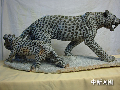 非洲匠人用5年時間打磨出來的等比等高“母子豹”石雕。