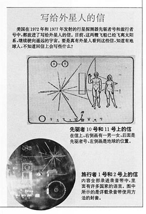 這種名片被認(rèn)為是一種與外星人進行直接溝通的方法。在名片上,人類以圖畫的形式表示出了太陽系、地球所在的位置、男人和女人的形象。人們希望當(dāng)探測器在飛出太陽系后萬一被什么外星智慧拾獲,會發(fā)現(xiàn)我們的存在。
