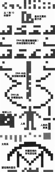 1974年11月16日下午,位于波多黎各的大型射電望遠(yuǎn)鏡向武仙座方向發(fā)送一個給外星人的信號,這個信號持續(xù)3分鐘。信息中以符號的形式描述了1~10的數(shù)字、太陽系、地球和人類的DNA。這條信號以光速飛向25000光年以外的一個星團。也就是說,假如那里有外星人收悉我們的信號,然后再給我們作出回復(fù)的話,我們會在5萬年后收到它。