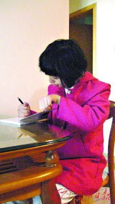 淡粉色毛衣、棗紅色外套、白色褲子、可愛的娃娃頭短發(fā),瘦小的陳楠看起來像是一名中學(xué)生。盡管她每邁一步就要停下一會(huì)調(diào)整步伐,但當(dāng)記者走進(jìn)她家時(shí),她還是熱情地起身到門口迎接。雖然說話比較費(fèi)力,吐字也并不清晰,但她的思維和反應(yīng)都很快,她會(huì)側(cè)仰著頭仔細(xì)傾聽你的問題,然后迅速接下話茬,努力嚅動(dòng)嘴唇發(fā)音,說到興起之處,她還會(huì)像個(gè)孩子般發(fā)出爽朗的笑聲!拔易畲蟮膲(mèng)想就是當(dāng)個(gè)作家,不過還真沒想到在25歲時(shí)就能出書呢。”