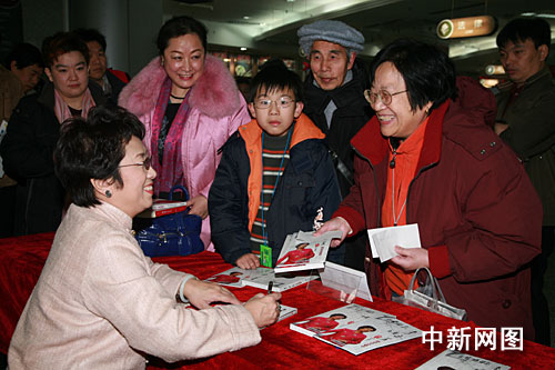 中新網(wǎng)1月19日電 1月17日上午10點(diǎn)30分,北京電子音像出版社在西單圖書大廈舉行《李玉芙——京劇唱腔專輯》簽售儀式。著名京劇表演藝術(shù)家、梅蘭芳親傳弟子、梅派名家李玉芙和著名話劇表演藝術(shù)家石維堅(jiān)出席了該儀式,F(xiàn)場(chǎng)聚集了眾多李玉芙的忠實(shí)觀眾,爭(zhēng)相與心目中的大師合影留念,氣氛十分熱烈。