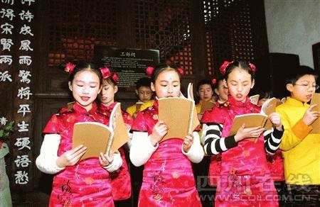 昨日的草堂高朋滿座,著名學(xué)者、詩(shī)人鐘樹(shù)梁、流沙河、張志烈等文人雅士,杜甫草堂詩(shī)書畫院的藝術(shù)家及省內(nèi)文博單位代表悉數(shù)到場(chǎng),近萬(wàn)成都市民和外地游客也在祭拜活動(dòng)開(kāi)始前涌入草堂。10時(shí)整,兩扇朱門開(kāi)啟,一面印有“草堂人日”字樣的幡旗于門前緩緩升起,人們屏住呼吸,現(xiàn)場(chǎng)異常安靜。一陣稚嫩童聲傳來(lái),眾人細(xì)聽(tīng),得悉孩童們念誦的正是憂國(guó)憂民憂天下的杜甫所作傳世詩(shī)歌:“安得廣廈千萬(wàn)間,大庇天下寒士俱歡顏,風(fēng)雨不動(dòng)安如山!”、“國(guó)破山河在,城春草木深”、“兩個(gè)黃鸝鳴翠柳,一行白鷺上青天”……一邊應(yīng)和的是古琴大師們演奏的悠揚(yáng)古琴,詩(shī)圣杜甫心中的那份蒼涼詩(shī)情,瞬時(shí)穿越千年時(shí)光,直達(dá)眾人心中。一杯薄酒,一束臘梅,現(xiàn)場(chǎng)市民游客逐一上前向詩(shī)圣像鞠躬行禮,表達(dá)對(duì)杜甫的敬意。