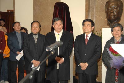 北京市委常委、宣傳部長、副市長蔡赴朝,老舍先生的子女舒乙先生、舒濟(jì)女士和舒雨女士,以及參加國際老舍研討會的一百八十余位專家學(xué)者,北京人藝全體院領(lǐng)導(dǎo)和各部門代表,當(dāng)年《龍須溝》首演陣容的演員代表鄭榕、李濱、舞美設(shè)計(jì)宋垠、韓西宇等,于是之先生的夫人李曼宜女士,新版《龍須溝》劇組代表顧威導(dǎo)演,老舍頭像作者、中央美術(shù)學(xué)院教授、雕塑藝術(shù)家孫家缽等出席了揭幕儀式。當(dāng)晚7時(shí)許,蔡赴朝和舒乙一起,共同為老舍先生雕塑揭幕。至此,中國近代文學(xué)史上的三位大師——老舍、焦菊隱、曹禺的銅像共同屹立、“聚首”在首都劇場大廳內(nèi),供后輩瞻仰!