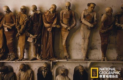 在歐洲,對尸體進(jìn)行干燥處理和保存算是西西里島的獨(dú)門絕活。意大利其他地區(qū)也有此類現(xiàn)象,但絕大部分還是在西西里,這里的生者與死者之間有著更為緊密的聯(lián)系。有些神父對這種保存尸體寄托哀思的方式心懷不安,把其中一些從地下墓穴里運(yùn)出掩埋到墓地里。沒人知道埋了多少,也沒人知道這種干尸究竟有多少具。這讓人不免疑惑:為什么會有人這么做?把腐化的尸體拿來展覽用意何在?
