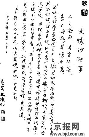 昨天(21日)傍晚,文懷沙家屬向本報(bào)提供了文懷沙啟事、文懷沙之子文斯以及友人趙缺先生的三篇文章,回應(yīng)李輝質(zhì)疑。本報(bào)來(lái)函照登,以饗讀者!幷
