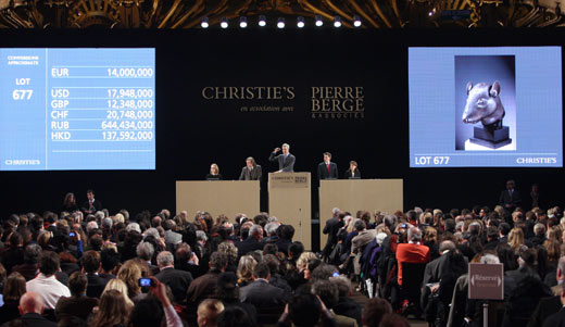 是晚,在巴黎大皇宮舉辦的“伊夫·圣洛朗與皮埃爾·貝爾熱珍藏”專場拍賣會上,編號為六七七和六七八的圓明園鼠首和兔首銅像分別以一千四百萬歐元被買家通過同一電話代理人買走。