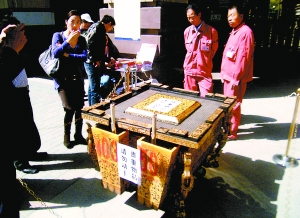 昨天中午,記者看到一只編號為0350的奧運(yùn)缶擺在該小區(qū)門前,其四周用鎖鏈與地面連接,缶上貼著“貴重物品,請勿觸摸”的紙條。旁邊坐著兩名自稱是中國金銀幣禮品網(wǎng)員工的女孩。據(jù)她們介紹,所賣的缶都是奧運(yùn)會開幕式上用過的,完好無損,均由單位以每個(gè)10萬元左右的價(jià)格從官方拍得,除部分?jǐn)[在分公司展示外,剩下六七只準(zhǔn)備售賣,現(xiàn)在明碼標(biāo)價(jià)賣12.8萬!懊恐惑径加惺詹刈C書和電子身份證書,可以上網(wǎng)核查真?zhèn)。擺在這里的是供展示,如果市民有興趣,可以留下手機(jī)號!辟u缶人員說。