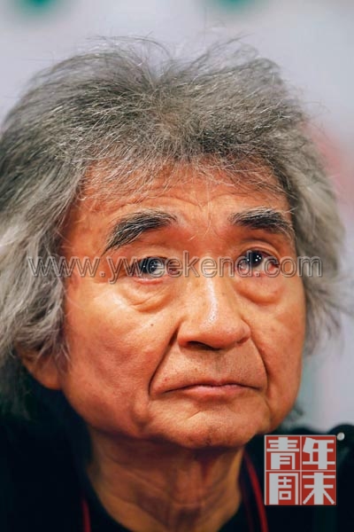 3點(diǎn)45分,小澤征爾終于出現(xiàn)了。你很難把這位傳奇音樂家與他73歲的高齡聯(lián)系起來。他有著年輕人一樣的精神面貌,目光炯炯有神,步履輕快有力,動作靈活敏捷。入座后,記者以為他會因遲到謙遜地跟大家道歉,結(jié)果他語出驚人——“國家大劇院太大了,我一進(jìn)來就轉(zhuǎn)向,找了半天才找到,喲,你們不錯啊,都能找到,真厲害!痹趫鲇浾弑凰旱霉笮Α