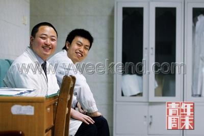 在整容室里,因為同齡,張洋和張祺關系很好。張祺相對活潑點,他跟張洋講起昨晚做過一個夢,夢見一哥們掉水里了。在夢里他哈哈地樂著!鞍滋觳荒苄Γ砩献鰤舨拍苄!睆堨靼腴_玩笑地說。有時候,哥倆做久了這份工作也感到壓抑,晚上必須找朋友喝酒。朋友都會好奇他們的工作,都覺得怎么也得一月上萬。張洋跟記者嚴肅澄清:真的只有3000多,非常普通的工資標準。