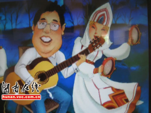 卡通片中,張家界市市長趙小明以卡通形象出現(xiàn),手拿吉他載歌載舞,旁邊還有一行文字標明:“張家界市市長趙小明”。