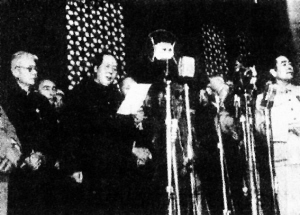 周恩來(lái)總理和中蘇友協(xié)會(huì)長(zhǎng)宋慶齡、副會(huì)長(zhǎng)劉少奇到前門(mén)車(chē)站歡迎。團(tuán)長(zhǎng)是蘇聯(lián)著名作家、蘇聯(lián)作協(xié)總書(shū)記法捷耶夫,代表團(tuán)中還有著名作家西蒙諾夫與好些有名的藝術(shù)家及高級(jí)干部,全團(tuán)約有40多人。當(dāng)時(shí),因?yàn)榭陀^環(huán)境和條件的限制,未能邀請(qǐng)外國(guó)的政府代表團(tuán)或政黨代表團(tuán)參加。這個(gè)蘇聯(lián)的民間代表團(tuán),與已經(jīng)在京的朝鮮人民代表團(tuán),加上一個(gè)來(lái)解放區(qū)訪問(wèn)的意大利共產(chǎn)黨中央委員斯巴諾,是有幸出席開(kāi)國(guó)大典的僅有的外國(guó)人了。蘇聯(lián)的代表團(tuán)剛剛安頓下來(lái),下午就興奮地登上了天安門(mén)城樓。