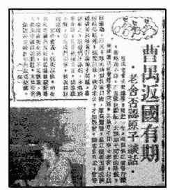 曹禺老舍去美國講學(xué),將近一年,報(bào)間偶記彼等行蹤,皆略而不詳。正當(dāng)舉世紛紜,大議原子彈的時(shí)候,美國通訊社曾傳老舍談話,主張?jiān)訌棏?yīng)守秘密,以出制蘇聯(lián)。以其不類此幽默作家口吻,群為驚怪。最近隨馮玉祥氏挾國的吳組緗,到美以后,詢及老舍,才知誤會(huì)。據(jù)老舍自云,曾旁聽歐美科學(xué)家討論原子問題,事誠有之,但他們所講的,多為科學(xué)術(shù)語,且多歐洲方言,聽還聽不懂,豈有班門弄斧,發(fā)表談話的道理。