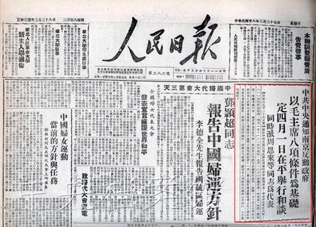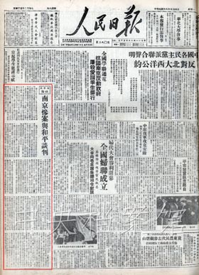 4月1日,由張治中、邵力子、黃紹竑、章士釗、李蒸、劉斐組成的南京國民黨政府談判代表團(tuán)到達(dá)北平,周恩來等設(shè)宴招待。以周恩來為首席代表,林伯渠、林彪、葉劍英、李維漢、聶榮臻為成員的中共代表團(tuán),開始與國民黨代表團(tuán)舉行和平談判。4月15日,形成八條二十四款的《國內(nèi)和平協(xié)定》。但結(jié)果,南京政府拒絕接受協(xié)定,徹底暴露了假和平的真面目。