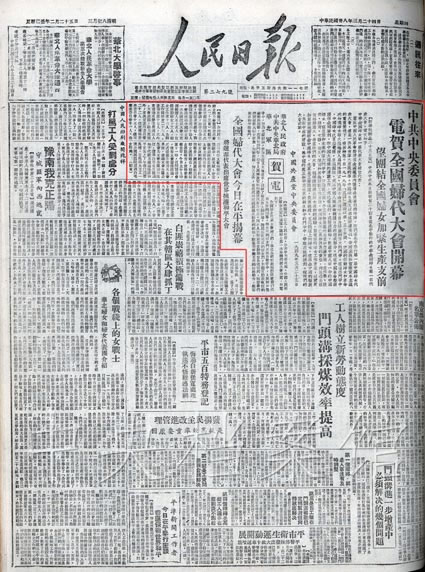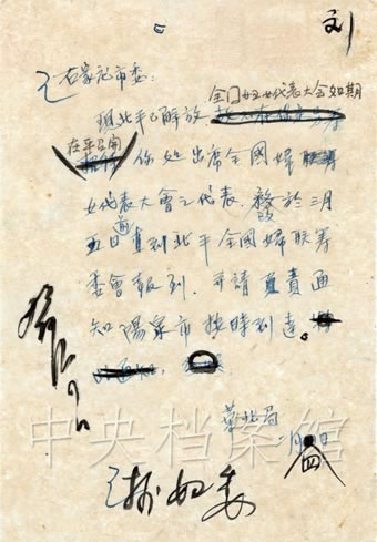 1949年3月24日——4月3日,第一次全國(guó)婦女代表大會(huì)在北平召開。毛澤東接見了全體代表,并為大會(huì)題詞:“為增加生產(chǎn),為爭(zhēng)取民主權(quán)利而斗爭(zhēng)!敝泄仓醒胫码娮YR。