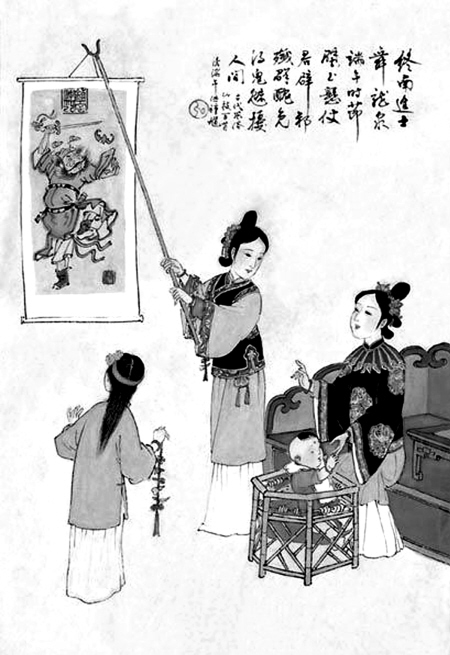 端午節(jié)期間,有些地方還流行居室中懸掛鐘馗像的習俗,據(jù)清代《北平風俗類征》記載:“五月初一至初五為端陽節(jié),午時以朱墨畫鐘馗像,用雞血點眼,俗稱‘朱砂判’者懸屋中,謂能驅(qū)邪!鳖櫟撛谒摹肚寮武洝分幸灿杏浭觯骸斑m逢端午,堂中掛鐘馗畫圖一月,以祛邪魅!辩娯改颂瞥忻嫾覅堑雷庸P下的人物。據(jù)宋代《醉翁談錄》云:“除夜,舊傳唐明皇是夕夢鬼物,名曰鐘馗,既覺,命工繪畫之。至今人家圖其形,貼于門壁!毕鄠鳎泼骰世盥』淮尉貌〔挥,偶有一夜,夢見一大鬼捉去一小鬼,大鬼聲稱自己名鐘馗,試武舉未中,誓為皇帝陛下除天下妖孽。唐明皇夢醒,即刻病好。于是,便命吳道子將夢中的鐘馗捉鬼作成一幅畫,掛于宮中以避邪和鎮(zhèn)妖。