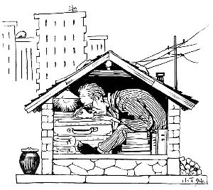 陳四益回憶中,丁老有著老一輩知識分子的風骨,他說:“他的生活一直很艱苦,但是他從來不挑挑揀揀!碑斈,丁老師給巴金等作家的書配插畫時,正在美術(shù)館做給畫貼標簽的工作,他就是在那些標簽紙上畫書的插圖的。丁老師的住房條件一直十分艱苦,房子很小,最后屋子里東西堆到放不下,他就只好自己去租了一間老房子搞創(chuàng)作。(如圖丁聰漫畫《書中沒有黃金屋》)