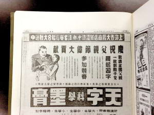 還是在同一張報(bào)紙上,當(dāng)天還刊登了一則以《慶祝父親節(jié)偉大貢獻(xiàn)》為大標(biāo)題的1/3版廣告。這是一家墨膏廠的廣告,副標(biāo)題為《敬請(qǐng)全國(guó)父親一致鼓勵(lì)子女晨起習(xí)字》,發(fā)動(dòng)“父親節(jié)書法競(jìng)賽活動(dòng)”?梢姡霉(jié)日促銷商品的歷史由來(lái)已久。