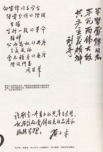 大約過了兩三天,《中國青年》雜志編輯部的同志打電話到毛主席辦公室,詢問主席是否已經(jīng)答應(yīng)寫題詞。當(dāng)時(shí),我了解毛主席已經(jīng)看過《中國青年》雜志的信,但未作什么表示,我便如實(shí)地轉(zhuǎn)告。他們說,《中國青年》雜志在3月1日出版,能否請主席在2月25日前寫好,因?yàn)橛∷⑦需要一周的時(shí)間。我將他們的要求報(bào)告了毛主席。毛主席讓我先擬幾個(gè)題詞供他參考。我回辦公室,思索了一番,擬好了十來個(gè)題詞,立即送給他。我現(xiàn)在還可以回憶起幾個(gè)題詞的大致內(nèi)容。如:“學(xué)習(xí)雷鋒同志全心全意為人民服務(wù)的思想”、“學(xué)習(xí)雷鋒同志鮮明的階級立場”、“學(xué)習(xí)雷鋒同志艱苦樸素的作風(fēng)”、“學(xué)習(xí)雷鋒同志毫不利己專門利人的優(yōu)良品德”,“學(xué)習(xí)雷鋒同志勤奮好學(xué)的精神”等等。