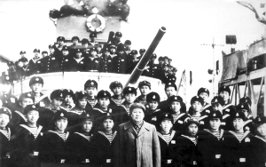 在艦上,毛主席看望了戰(zhàn)士們以后,便到了后主炮“130”大炮的前面看操演。馮尚賢開始指揮來這里接受檢閱的艦艇,毛主席看了很滿意。之后,一行人就到了會(huì)議室。