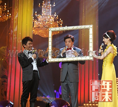 這時(shí),一段比賽舞蹈結(jié)束,該三個(gè)主持人一起上臺(tái)了,忽然找不到了吳宗憲,只聽(tīng)年輕的女主持人著急得有些變了腔調(diào):“憲哥!憲哥快上!”趙忠祥手握話筒拉了一下女主持人,聲音沉穩(wěn)地說(shuō):“不著急,不著急!眳亲趹楋w快地從暗處跑出,合上手機(jī),三人整了一下裝,穩(wěn)步上臺(tái)。