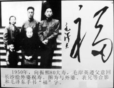 1950年,向振熙80大壽,毛岸英遵父意回長沙給外婆祝壽。圖為其與外婆、表兄等合影和毛澤東手書“!弊。