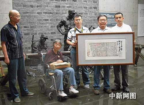 中新網(wǎng)成都7月7日電 (吳志維 楊杰) 今年7月7日是盧溝橋事變72周年紀(jì)念日。7日上午,臺兒莊滕縣保衛(wèi)戰(zhàn)鄒紹孟之遺腹子鄒汝祥來到建川博物館,將《滕縣保衛(wèi)戰(zhàn)英烈名單》、家書復(fù)制件捐贈給該館珍藏。