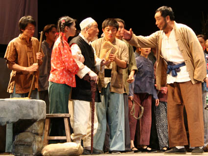 2005年9月6日至8日,由中國文聯(lián)主辦的紀(jì)念中國人民抗日戰(zhàn)爭暨世界反法西斯戰(zhàn)爭勝利60周年優(yōu)秀劇目展演抗戰(zhàn)獨幕劇專場在中央戲劇學(xué)院實驗劇場上演。91歲高齡的山尊老不僅擔(dān)任專場演出的總策劃,還在《求雨》中扮演一個回族老人宋大爺,這個形象設(shè)計是為了表現(xiàn)全國各族人民團結(jié)一致抗戰(zhàn)的決心。由于老人家年事已高,而在劇中還有一個磕頭的場面,因此在人物設(shè)計上,將由一個“小孫女”攙扶上場。當(dāng)大家關(guān)心他是否一定要出演這個動作時,老人說:“磕頭這個場面我一定要演,而且可以演,但是在起身的時候,可能要人扶一把。”他的敬業(yè)精神感動了所有年輕的演員。本報組織員工專門到劇場觀看了這場演出,山尊老對藝術(shù)的執(zhí)著精神和要牢記歷史、珍愛和平的諄諄教導(dǎo)讓大家非常感動。演出結(jié)束后,報社向山尊老敬獻了花籃,祝福老人家健康長壽、藝術(shù)生命長青。山尊老欣然與大家合影留念,并高興地說,謝謝報社對我的關(guān)心,謝謝你們!