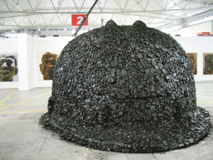 現(xiàn)場(chǎng)最扯眼球的作品是藝術(shù)家張建華的雕塑作品《礦工帽》。張建華說(shuō),這個(gè)礦工帽用了3噸煤塊貼滿(mǎn),更像一座孤墳,他希望以此反映農(nóng)民工在社會(huì)發(fā)展過(guò)程中付出的沉重代價(jià)。