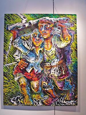 據(jù)介紹,在120位參展藝術(shù)家中,就有13位重慶藝術(shù)家,除了羅中立、傅文俊、李一凡三位參加主題展的藝術(shù)家外,還有10位來(lái)自川美的藝術(shù)家進(jìn)入了新人特區(qū)展。羅中立四幅最新力作首次展出也是雙年展另一個(gè)焦點(diǎn)。昨日,記者在現(xiàn)場(chǎng)看到,羅中立的四幅作品分別是《下梯的農(nóng)婦》、《過(guò)河系列一》、《吹燈》、《雷雨》,內(nèi)容都圍繞鄉(xiāng)村愛(ài)情。但在昨日的開(kāi)幕儀式上,羅中立和陳丹青都因故沒(méi)有出席。