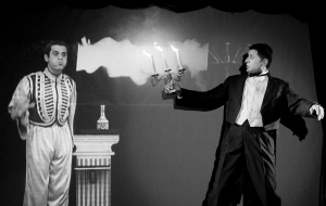 他的魔術(shù),每次都能迷惑所有人,因?yàn)闊o論怎樣,這都像兩個(gè)人“打配合”的表演:希臘魔術(shù)師、國際魔術(shù)界公認(rèn)最好的電影魔術(shù)大師喬哥斯,在幕布做成的鏡子前,捧出一個(gè)小瓶子。裊裊煙霧中,一個(gè)古裝魔術(shù)師從瓶中鉆出,如阿拉丁神燈的傳奇。一古一今兩個(gè)魔術(shù)師,能在鏡子內(nèi)外拿球互擲“打架”,能忽地變出槍射擊。更不可思議的是,鏡中的古代魔術(shù)師還能走出鏡外,成為一個(gè)有血有肉的人,原來的人,則變成“影子”。