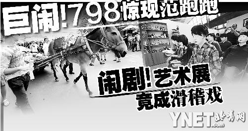 隨后,更多的“作品”給昨日的798平添了不少熱鬧——有趕馬車稱“驢子當(dāng)代藝術(shù)協(xié)會(huì)”的,有推小車賣尿壺稱“為人民服務(wù)”的,還有蒙上黑頭套逮誰(shuí)就問(wèn)“誰(shuí)能告訴我?guī)谀膬骸钡摹@場(chǎng)面倒是響應(yīng)了雙年展此前提出的“人人都是藝術(shù)家”的口號(hào)。不過(guò),記者從路邊一位不停抱怨的候補(bǔ)藝術(shù)家處得知,這些“創(chuàng)作”在開幕前的一刻都說(shuō)不算數(shù)了,因?yàn)檫@個(gè)單元的策展人突然宣布退出雙年展,也就是說(shuō)以上的現(xiàn)場(chǎng)行為表演都不再是雙年展的組成部分,而他本人是一位律師,本來(lái)準(zhǔn)備搞個(gè)現(xiàn)場(chǎng)法律咨詢,“這也是我的作品啊,但是現(xiàn)在不想實(shí)施了。”